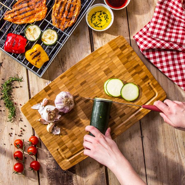 Planche à découper solide en bambou naturel en couches spéciales, excellente pour couper, diviser et attendrir les aliments. Une assiette ou un plateau peut être inséré dans le retrait au bas de la planche pour faciliter la collecte des ingrédients divisés. La planche à découper est inclinée vers la rainure pour recueillir les liquides. Avec des poignées confortables pour une manipulation sûre, une surface antidérapante. Laver à l'eau courante.