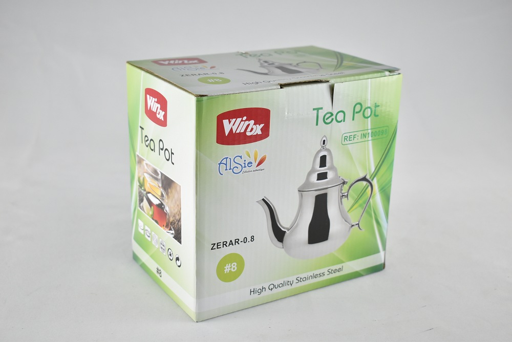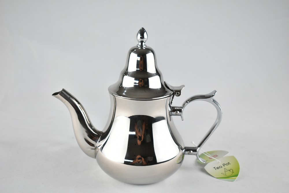 Théière Marocaine Inox d'une capacité de 0,8L litre de qualité supérieure, compatible avec les cuisinières à gaz, les plaque chauffantes électriques.