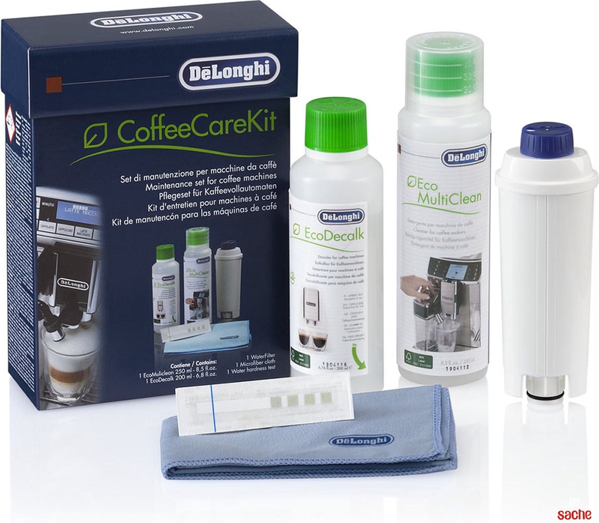 Le Kit entretien du Coffee DLSC306 contient une bouteille de détartrant de 200 ml, une bouteille d'EcoMultiClean de 250 ml, un filtre à eau, une bande de dureté de l'eau et un chiffon en microfibre. En d'autres termes, les ingrédients pour profiter plus longtemps de votre machine et de vos moments de café quotidiens.
